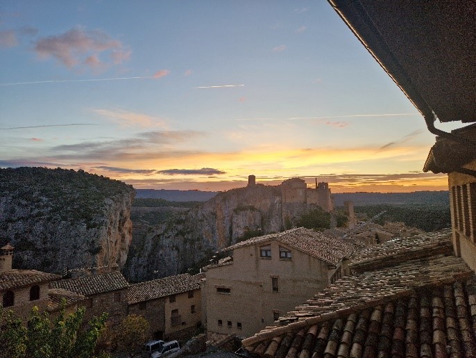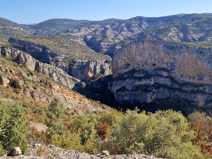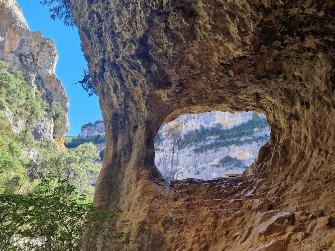 In iets meer dan drie kwartier rijden we naar het goed gerestaureerde Moorse stadje Alquézar. Vanuit daar wandelen we eerst naar de 2 mooie waterbekkens van Basacol en lopen we door richting de Abrigo van Quizans, een natuurlijke grot. Je wandelt vandaag met mooi zicht op diepe kloven (niet dichtbij afgronden) en met de hoge besneeuwde Pyreneeën toppen in de achtergrond. Op de voorgrond stijgen vale gieren op uit het labyrint van oude rivierkloven. Met de 300 dagen zonneschijn in Aragón is er bijna altijd thermiek. Op de terugweg loop je na de waterbekkens van Basacol een andere route naar Alquézar. De route is 8 km, je stijgt 430 m en daalt 390 m met een totale looptijd van 4,5 uur.